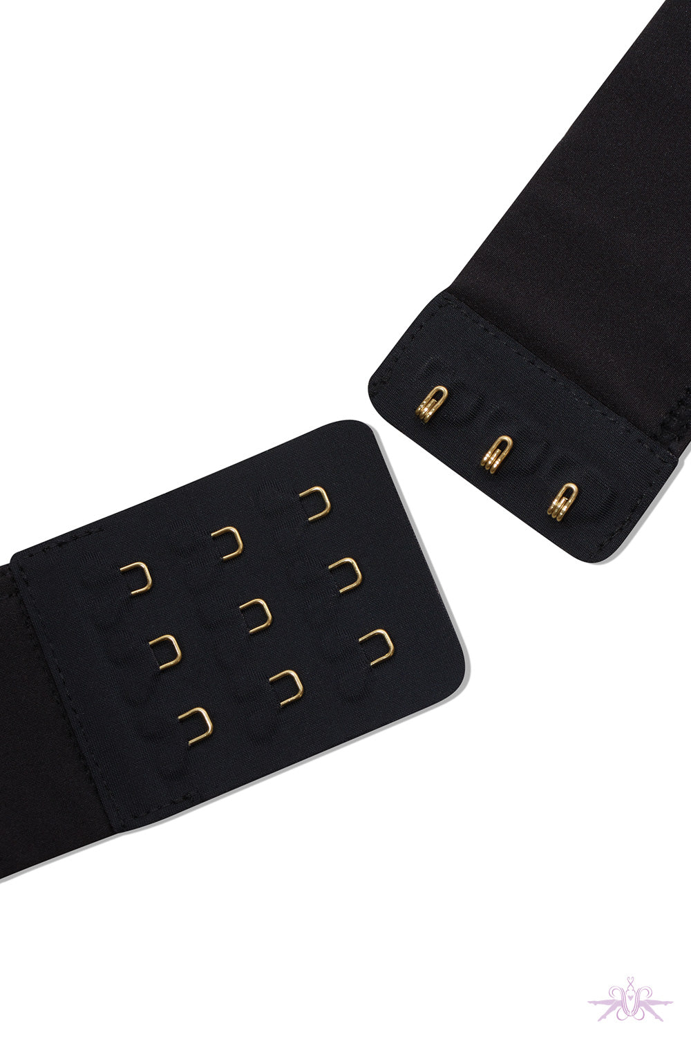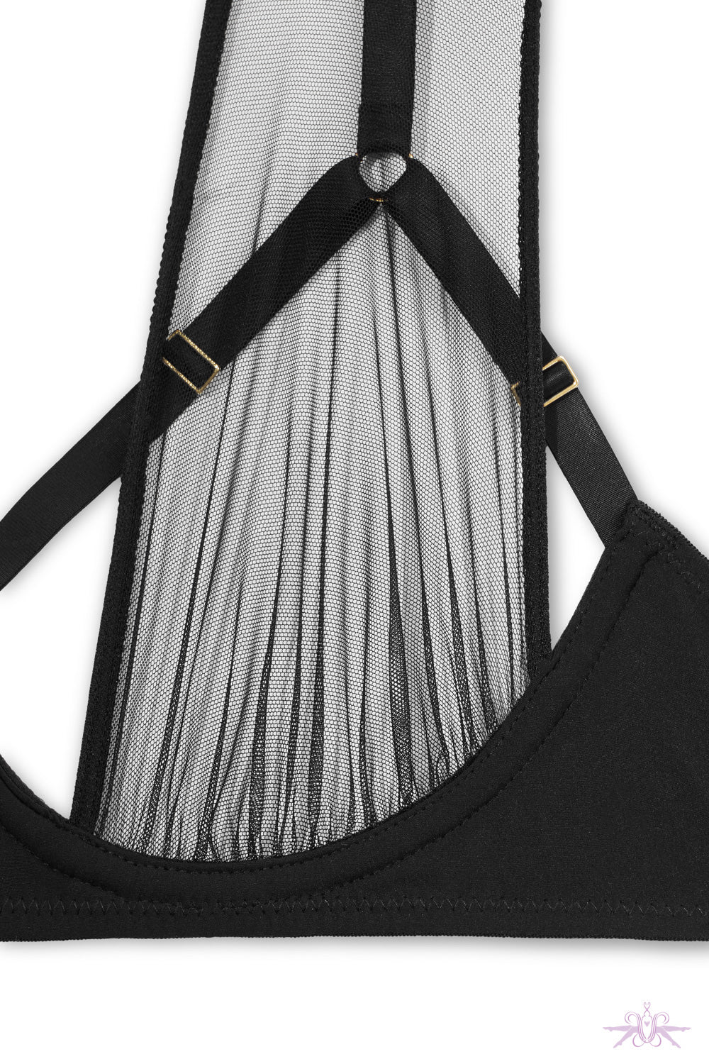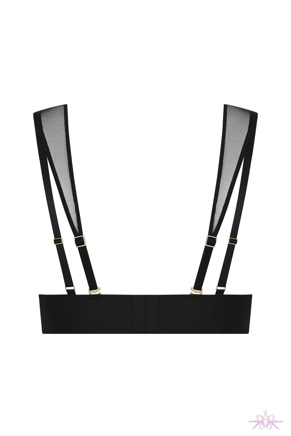 A daring cupless bra with sheer tulle foulards and contrasted by an opaque material on the back. The underwing shapes and supports the bust along with the set of adjustable, non-removable elastics at the front and back, highlighted by gold accessories. Fastens at the back with a smooth and fine adjustable clip.