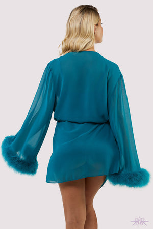 A gorgeous teal robe to give you that instant pick you up you need. It has glamour and sophistication with its sheer fabric and tie waist and is finished with a luxurious faux feather trim on the sleeves.