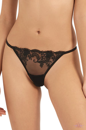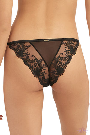 Beautifully delicate brief of superfine embroidered mesh. Floral-inspired designs swirl along the front top line and the back sections of the brief, adding movement and flattering definition. A central panel of plain mesh in the back section of the brief creates shape, whilst the slim banding for the waistband adds a provocative touch, highlighting the hip bones. Wear with the matching suspender belt for a stunning complete look.