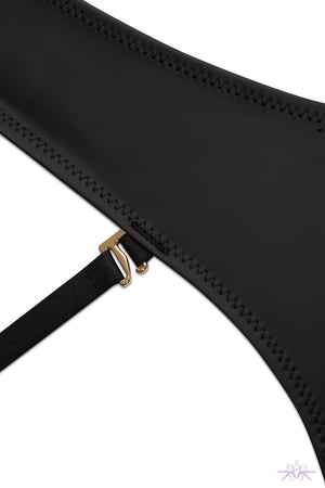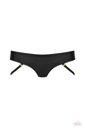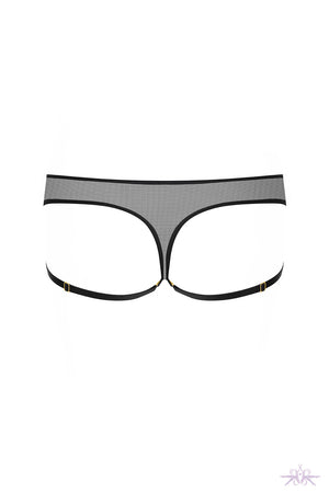A jock-strap style comprising two removable adjustable harnesses with golden ornamental trim that connects the front and the back to highlight the buttocks. Matching items are also available.