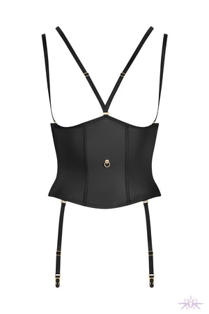 A beautiful matte leather look waist cincher from Maison Close. Really show off your curves in this stunning shape wear that enhances the waist. Suspenders, straps and choker harness are removable and can be adjusted with golden ornamental trims. The flexible vertical whalebones improve structure and support. Adjustable hook-and-eye fastening on the back. Matching items are also available.