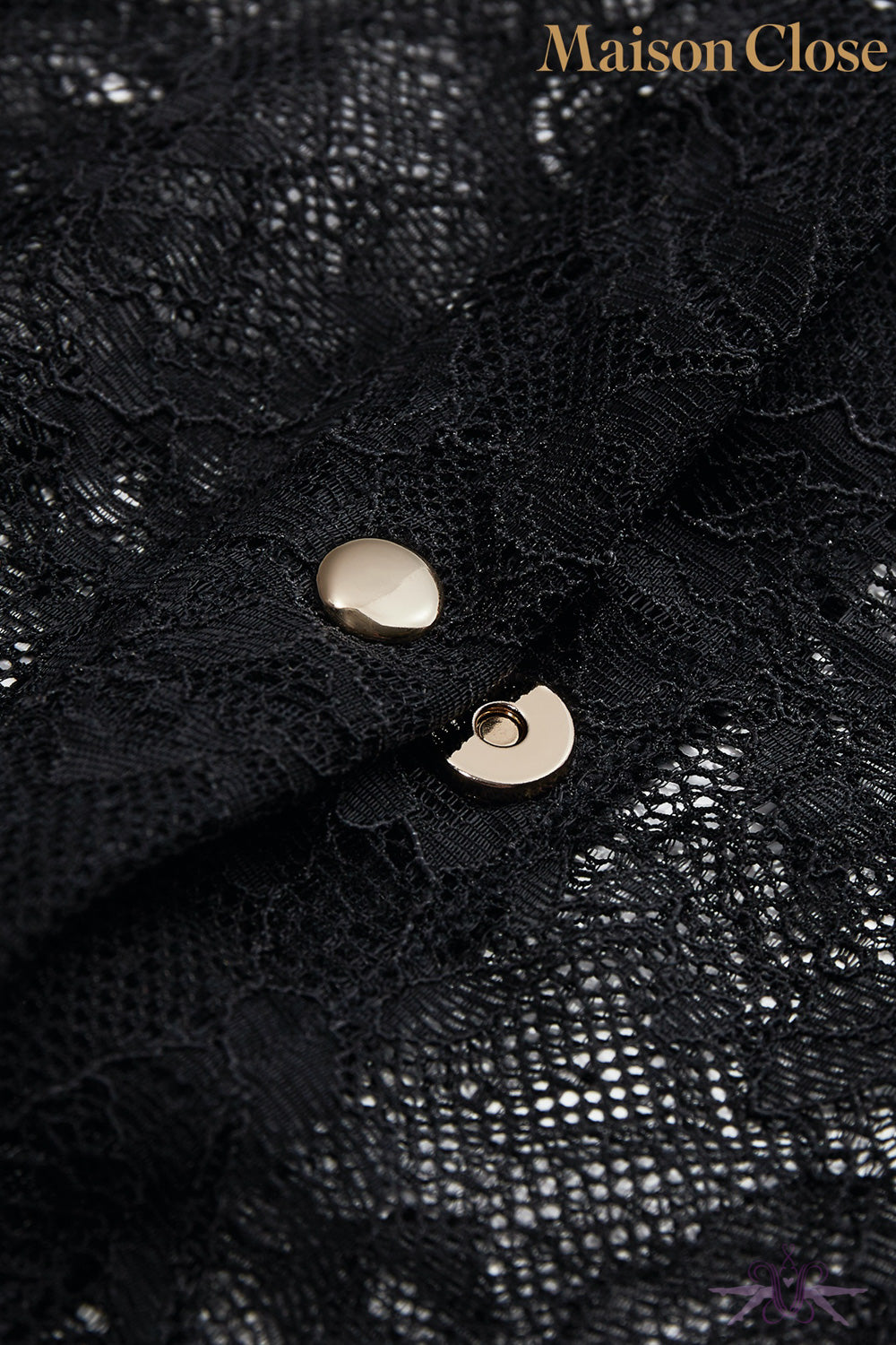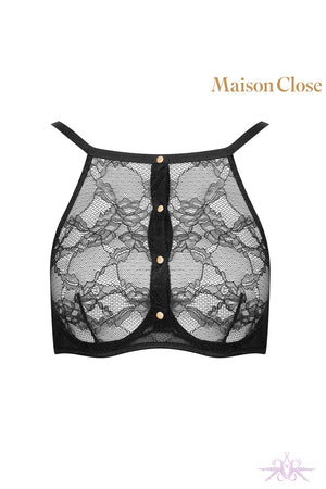 This openable bra from the Le Petit Secret collection at Maison Close is a gorgeous piece of lingerie. The sensual lace on the chest creates an alluring desire. The cut gives really good coverage and its wired frame support the breasts. Its adjustable straps on the back allow for a perfect fit and the magnetic gold buttons on the front are an invitation to open with ease. Matching thong is also available.
