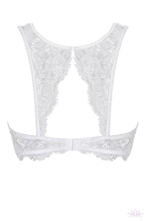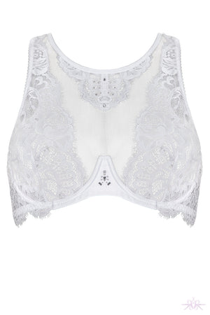 An alluring white bra in lace and tulle from the Marlene collection at Prelude Milano. This satin edge underwired bra is truly stunning with the sheer section covering yet enhancing the bust. The triangular section of lace that surrounds the breasts adds a gorgeous feminine accent and the silver Swarovski crystals in the centre add sparkle. The back of the bra has two vertical lace straps which are connected at the top. The bra is fastened by way of a hook and eye.