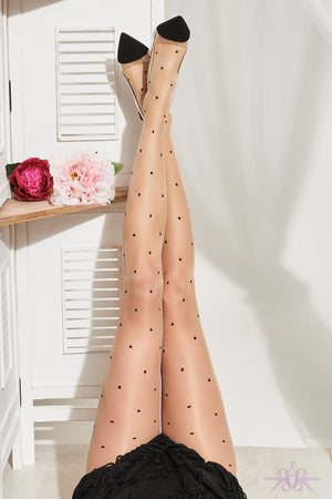 An elegant nude sheer tight with a delicate shimmer from Trasparenze. A gorgeous tight with a small polka dot making these a true classic. These tights are available in nude/black and black/black. Also available as a hold up.