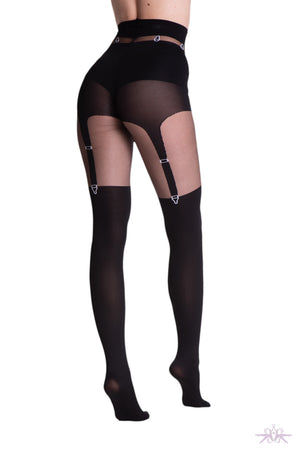 A seductive tight from Trasparenze that will surely excite. These tights have opaque faux stockings with the illusion of a suspender belt and clip detail. The sheer thigh adds to the excitement and reveals the stockings and belt design effectively. Available in black and cosmetic and simple black colour way.